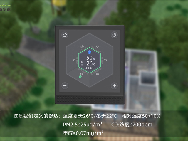 簡介:系統主控的舒適雷達圖:溫度夏天26°C/冬天22°C,相對濕度50±10%,PM2.5≤25μg/m3,CO?濃度≤700ppm,甲醛≤0.07mg/m3